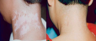 白癜风早期白斑多为指甲至钱币大,近圆形、椭圆形或不规则形,也有起病时为点状减色斑,境界多明显;有的边缘绕以色素带,初期大部分白癜风患者白斑面积较小,有极少数患者初期发病就很快,迅速演变为泛发性白癜风,白斑面积扩至全身。在少数情况下白斑中混有毛囊性点状色素增殖,后者可增多、扩大并相互融合成岛屿状,白斑处除色素脱失外,患处没有萎缩或脱屑变化。