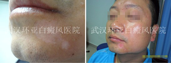 治疗效果:经过一个疗程的治疗薛先生白癜风发病部位白斑的部位出现色素岛,两个治疗疗程后患者白斑部位肤色明显加深。经过巩固治疗后,患者发病部位肤色恢复正常,脸颊白斑部位恢复正常肤色。气色情绪明显改变,随访病人,至今没有复发。