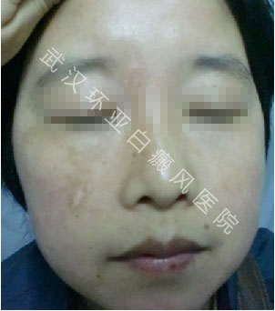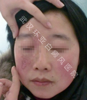 ▲病史:半年前,面部突然一个豆大白斑点,慢慢扩大。涂抹外用药治疗无效来我院治疗