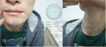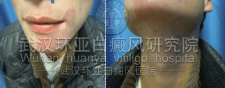 ▲病史:患者面部白斑9年,开始是颈部白斑,之后嘴唇附近出现白点,并逐渐连成一片,多次去医院使用药物治疗,效果不明显,且病情加重,后来我院接受治疗