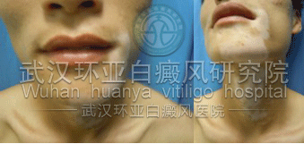 白斑在1年后,也就是小升初的时候长到了硬币大小,这让家里终于重视起来,到医院检查确诊为白癜风,当时的治疗方案只能是药物治疗,白斑一度得到控制,治疗因此而没有持续,这样治治停停,白斑逐渐扩散到下颌和嘴唇附近。