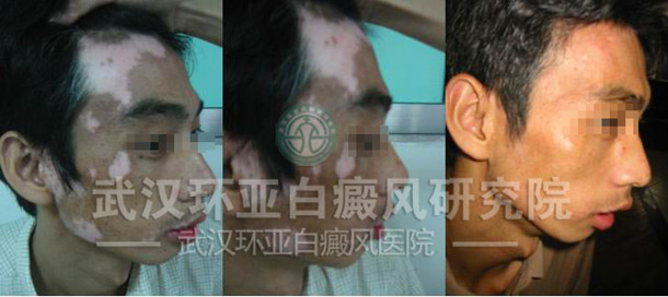 病例描述:据患者自述,刚开始是额头上一块米粒大小的白斑,并没有引起重视,在短短的半年时间里,白斑就从脸颊,眼角,耳根各处发出来,无奈之下,患者用遮盖剂涂抹,白斑仍然在继续扩散。