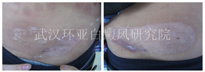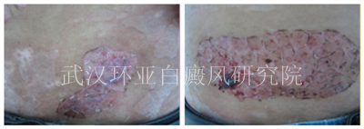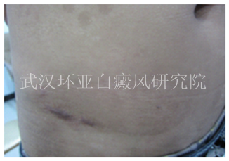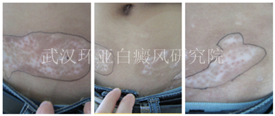 初诊:患者初诊时腹部和腹股沟部位有大面积的色素脱失现象,肉眼观察下白斑较分散,而且为瓷白色,记住伍德灯检查发现患者的腰部白斑处于稳定期,并呈现出乳白色,白斑区域有色素岛,白斑的纯面积大致为70CM2。商议决定同过分型分诊,多维治疗手术治疗。