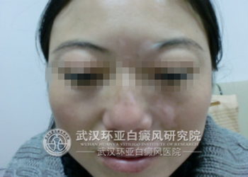 初诊:患者初诊是脸部白斑明显,白斑边缘颜色较深,检测发现黑色素堆积较多,白斑区域的黑色素仍然处在脱失状态,白斑周围堆积的黑色素含量向正常的皮肤区域逐渐减少颜色也逐渐恢复正常,诊断为少见的“三色白癜风”!
