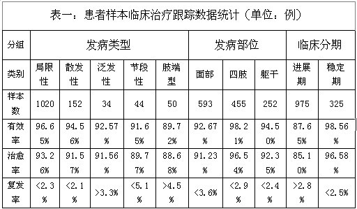 3.1 发病类型最终结果统计:通过对1300例患者跟踪,3例患者中途离开,临床有效率98.65%,治愈率93.26%;