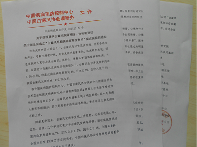 中国疾病预防控制中心、中国白癜风协会调研办联合印发〔2012〕37号文件——关于我国夏季白癜风疾病预防、诊治的建议暨关于在全国成立“白癜风早期确诊标准检测站”定点医院的通知。